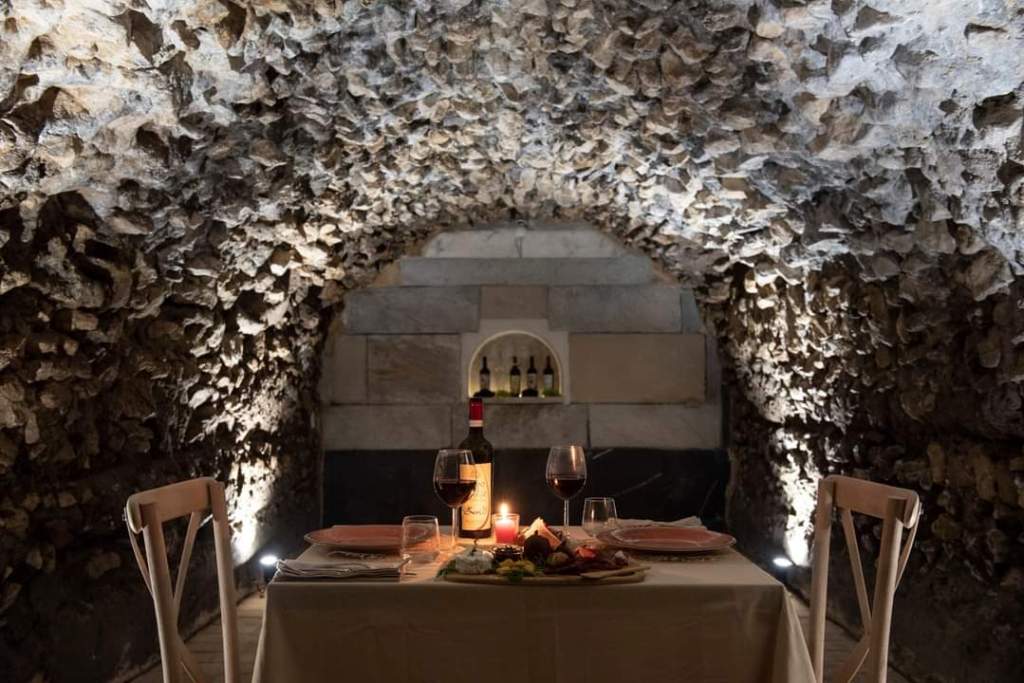 All’occorrenza, la suggestiva sala in pietra che ospita il migliore nettare degli dei, si trasforma in un luogo appartato per una una cena romantica a due.